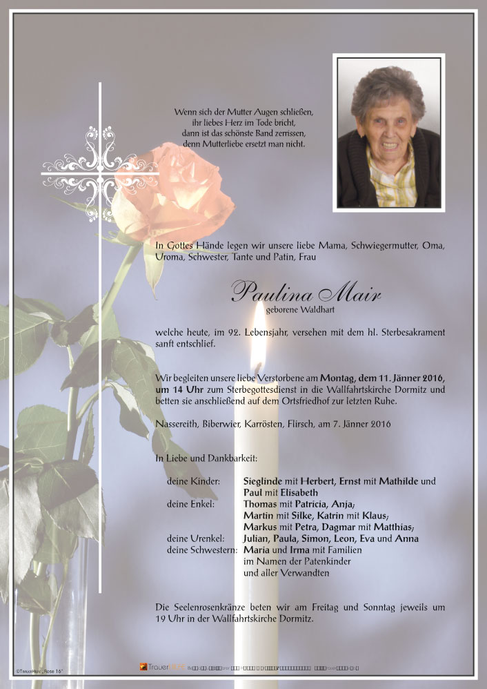 Aufrichtige Anteilnahme!11.01.2016 12:28 - Neuner Elmar u. Reinfrieda
