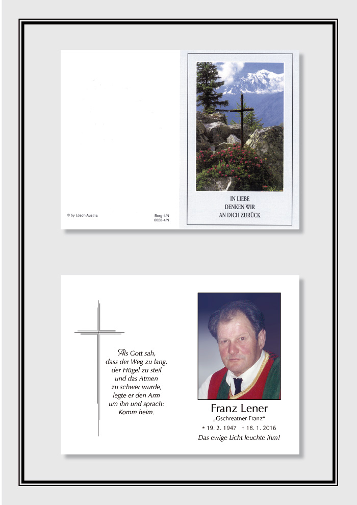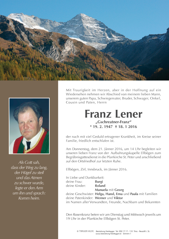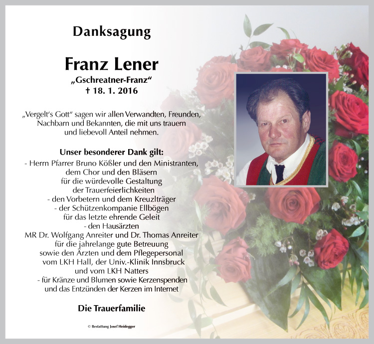 Bestattung wurde durchgeführt von: Karl Neurauter Karl Neurauter Bestattung Heidegger Brennerstraße 69 6150 - Steinach am Brenner Tel.: 05275 5211 zum Bestatter