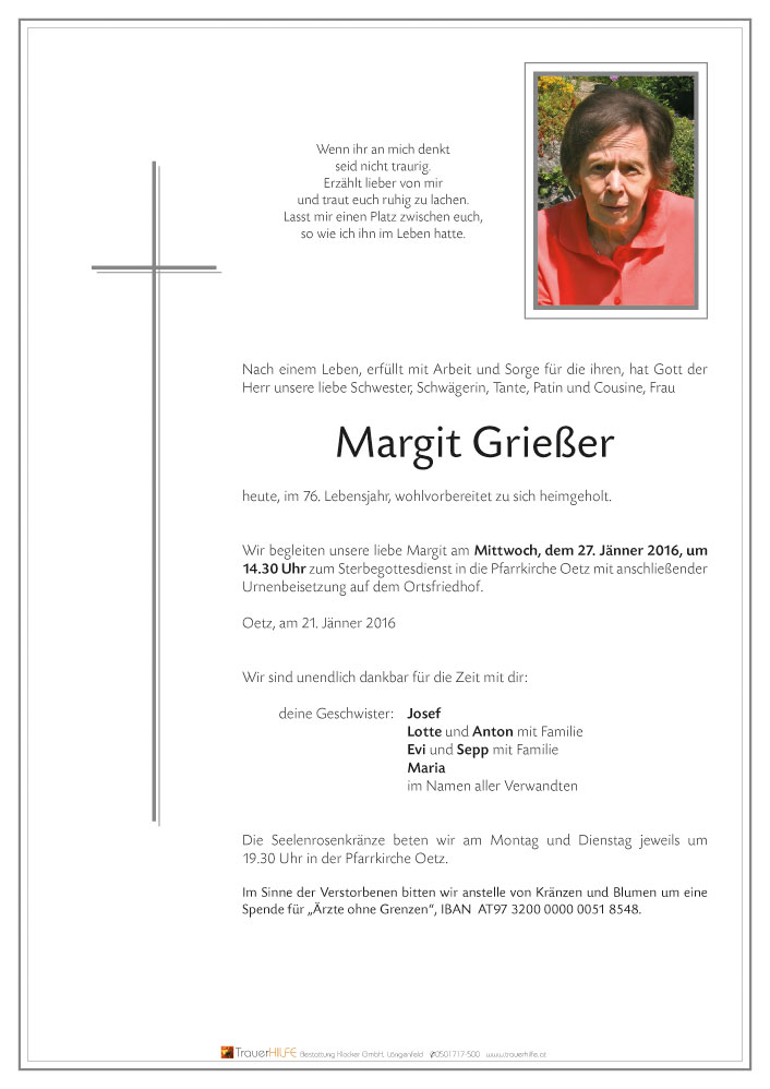 Tief betroffen und bewegt mit schmerzendem Herzen über das Ableben der von mir sehr geschätzten und verbundenen Margit ist es mir ein Bedürfnis ihren Angehörigen, insbesondere den Geschwistern Maria und Josef mein Beileid und aufrichtige Anteilnahme auszudrücken.