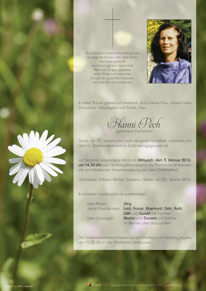 Aufrichtige Anteilnahme am Tode Eurer lieben Hanni entbieten Familie Scharfetter-Praxmarer,Gasthof Andreas Hofer Umhausen.28.01.2016 14:49 - Familie Scharfetter Umhausen