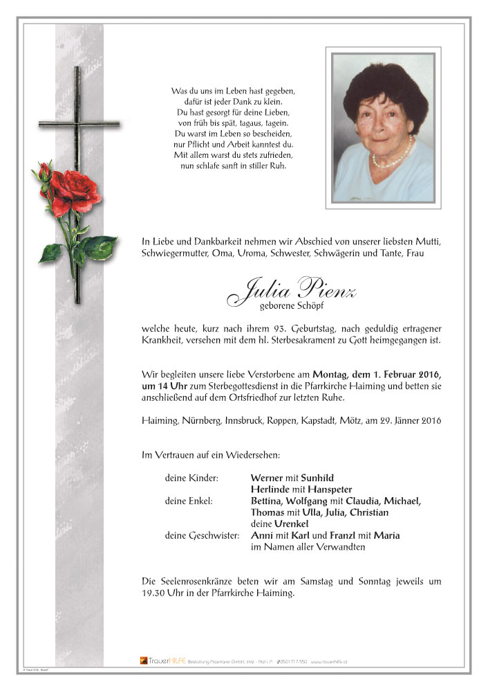 Mir bleiben ganz nette Erinnerungen an eure liebe Julia, die ich in ihren letzten Lebensjahren noch kennenlernen durfte. Sie hat so manche Erinnerung aus ihrem Leben mit mir geteilt, besonders an ihre Tage als Kindergärtnerin. Dafür bin ich dankbar.