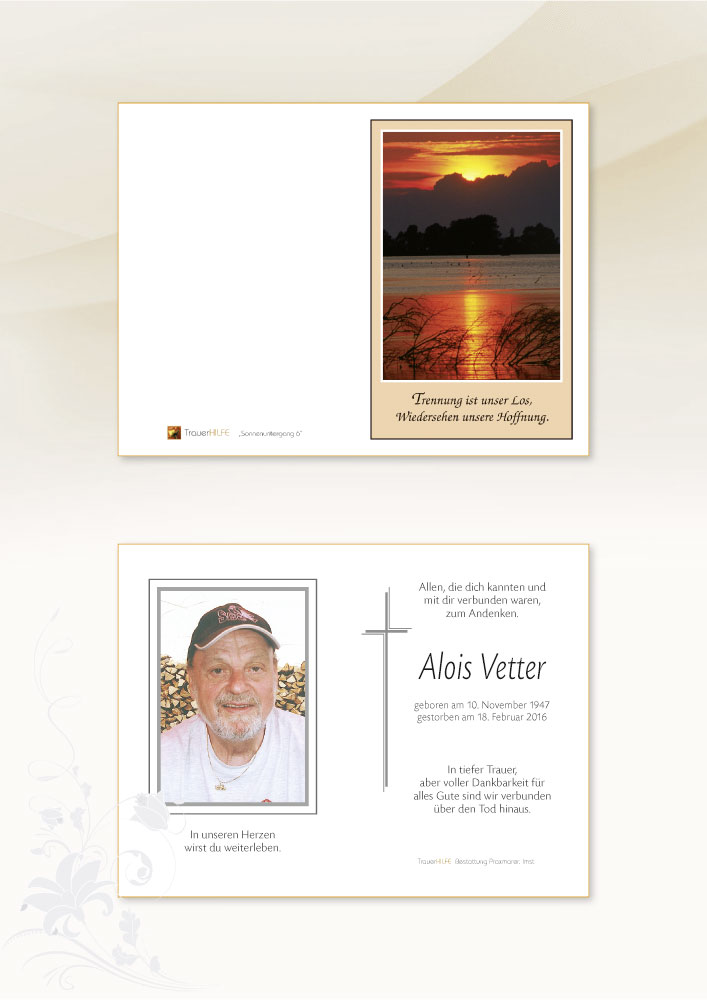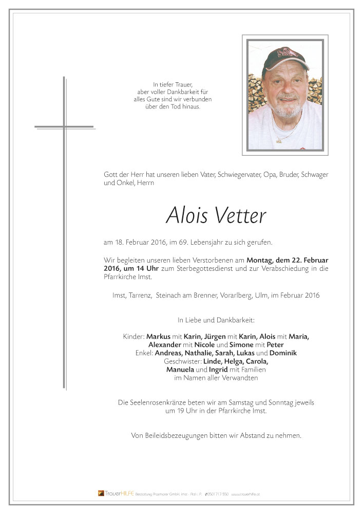 Zum Heimgang eures lieben Verstorbenen Vetter Alois möchten wir unser tiefes Beileid und Mitgefühl aussprechen! Walter und Maria Abler mit Familien20.02.2016 15:31 - Walter und Maria Abler