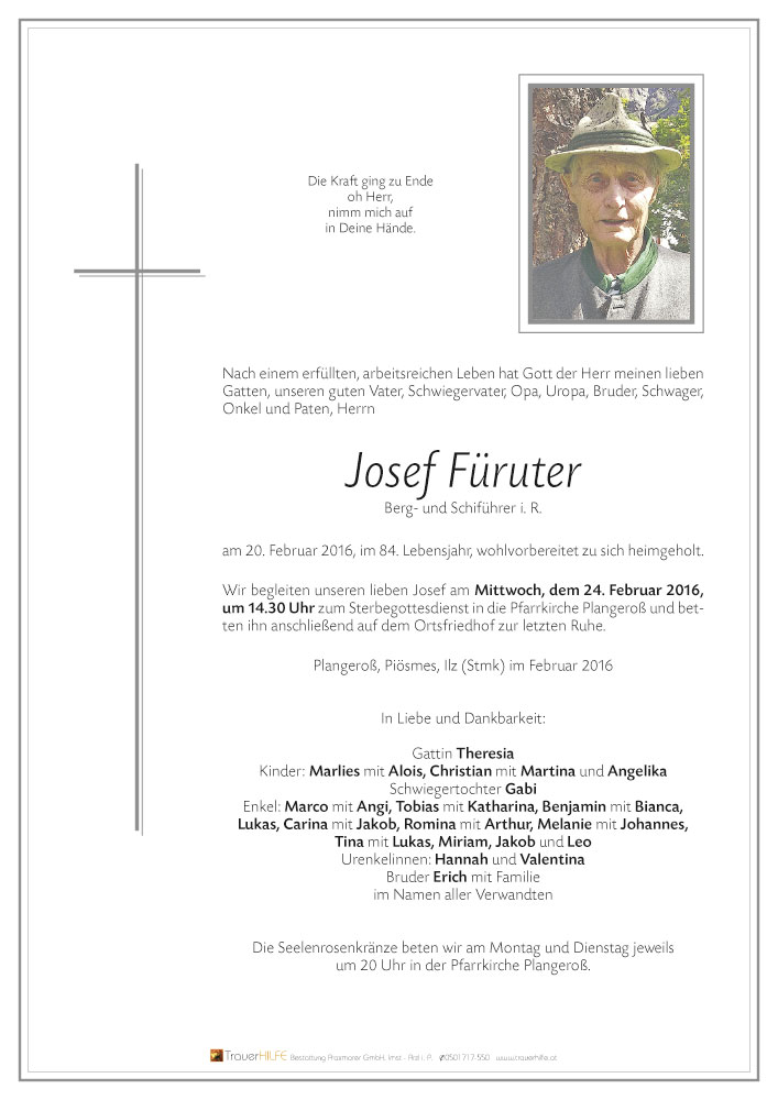 Josef war ein wundervoller Mensch und so werden wir Ihn in Erinnerung behalten. Wir trauern mit Euch und wünschen Euch allen für die Zukunft viel Kraft und Gottes Segen.