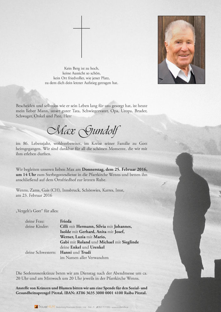 Unser aufrichtiges Beileid kraft und gottes vertrauen wünschen euch Manni und Gigi mit Familie24.02.2016 21:43 - Lechner Manfred