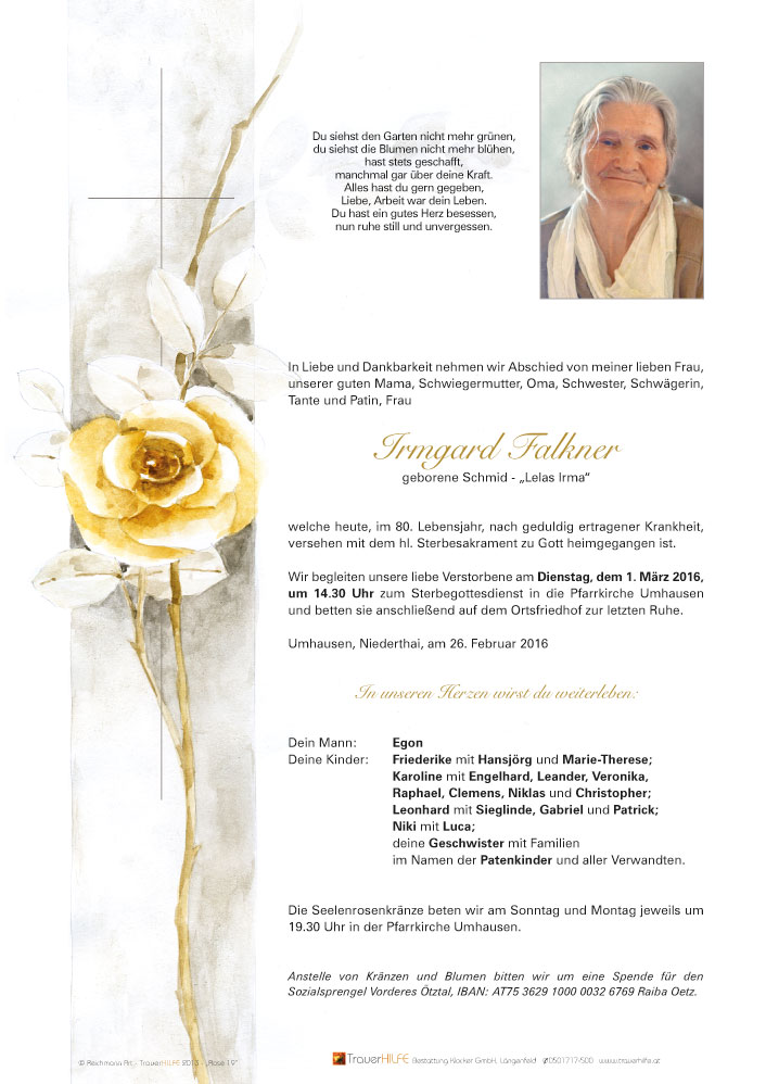 Das gesamte Team des Sozial- und Gesundheitssprengel Vorderes Ötztal wünscht viel Kraft in den schweren Stunden und bedankt sich herzlich für das entgegen gebrachte Vertrauen.02.03.2016 11:12 - SGS Vorderes Ötztal