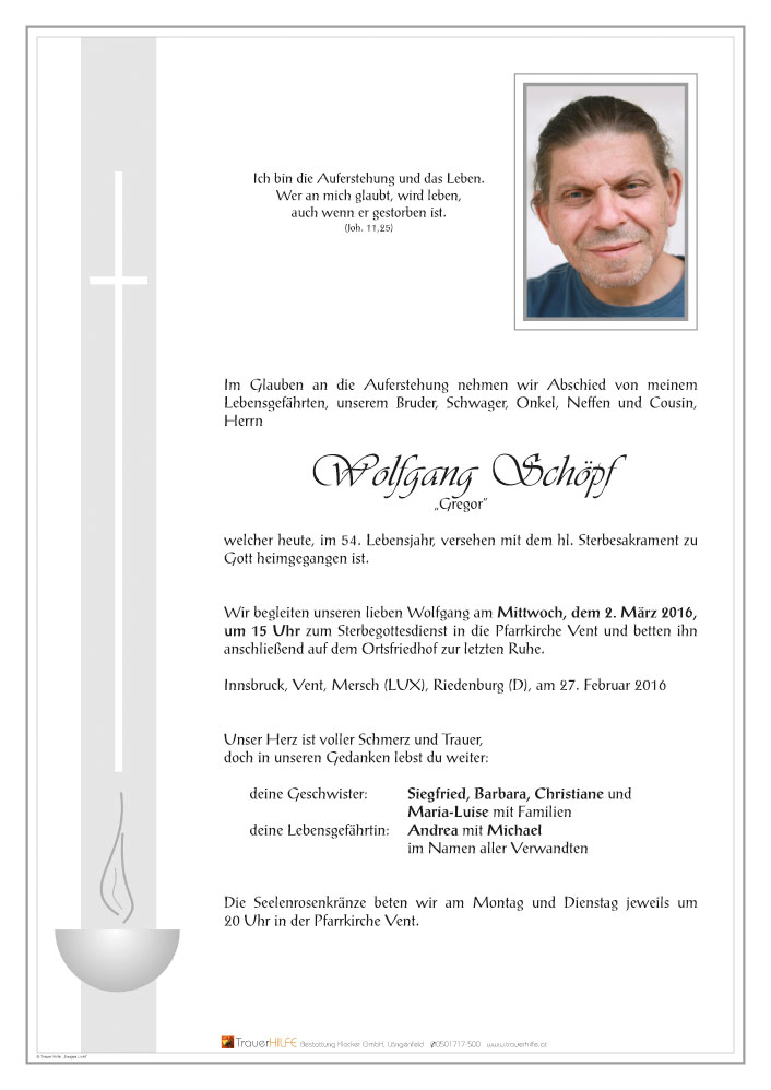 Neue Kerze für Wolfgang Schöpf entzünden.