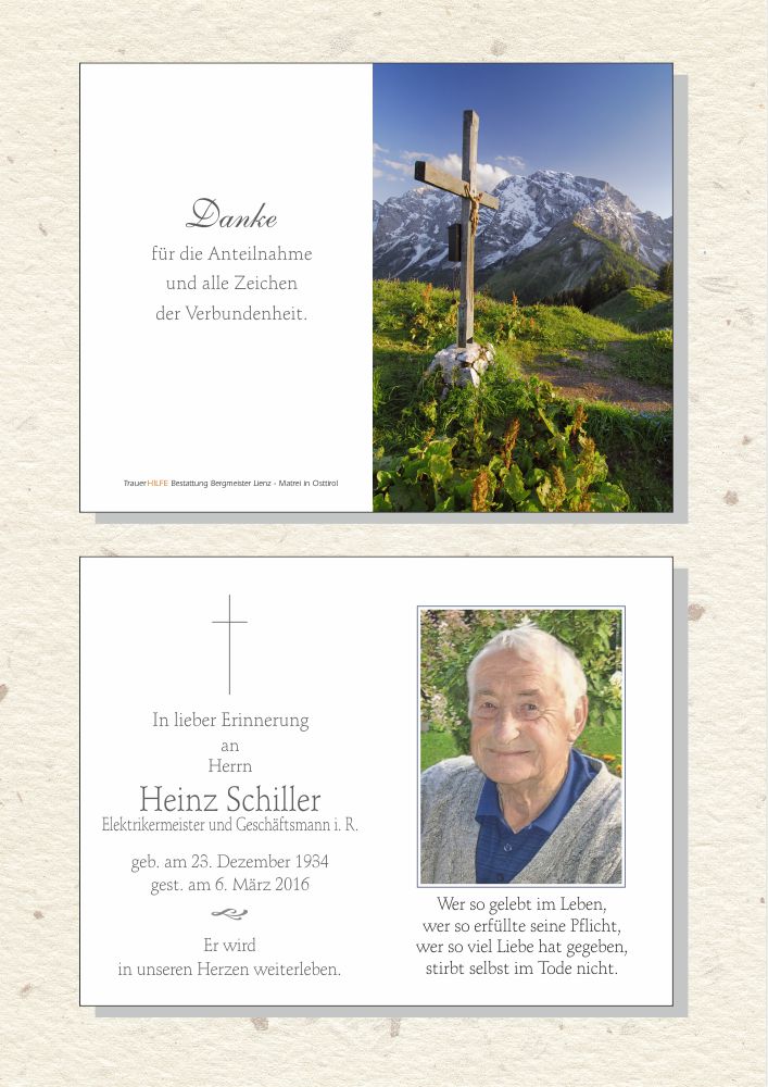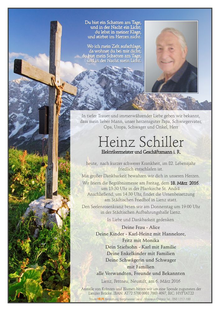 Liebe Frau Schiller, wir möchten Ihnen unsere aufrichtige Anteilnahme entbieten und Ihnen in dieser schweren Zeit viel Kraft und Gottes Segen wünschen.14.03.2016 22:36 - Harald und Karoline Gamper