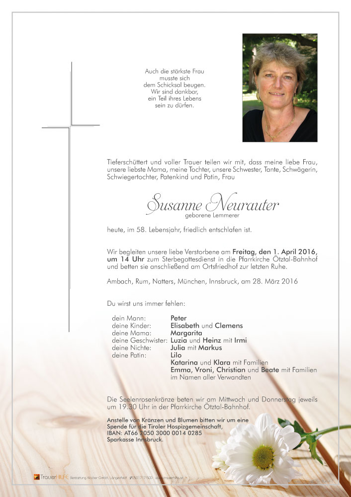 Aufrichtige Anteilnahme zum Tode Eurer lieben Susanne entbieten Familie Bauer Kathrin und Mitarbeiter vom Gasthof Krone. Wir wünschen Euch viel Kraft und Stärke in dieser schweren Zeit.30.03.2016 13:01 - Gasthof Krone Umhausen