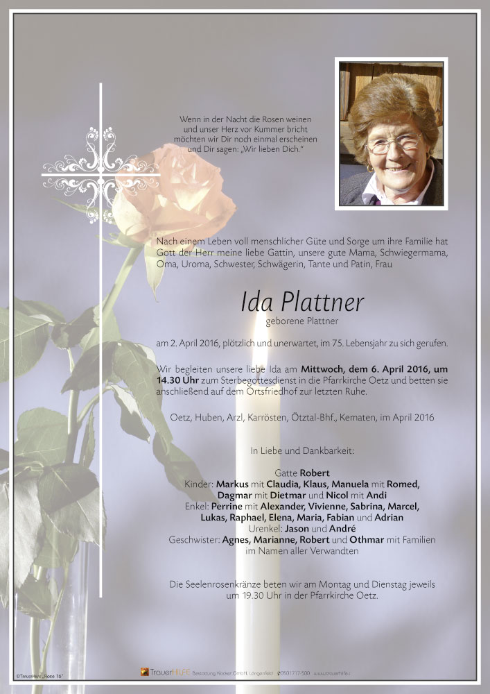 Vor vielen Jahren haben wir mit unseren Kindern Nicole und Tobias viele schöne Urlaube bei euch auf dem Plattner-Hof verbracht. Gestern Abend haben wir darüber gesprochen und uns daran erinnert. Die liebevolle Fürsorge von Ida und Robert hat immer dazu beitragen, dass wir uns in der Atmosphäre so wohl gefühlt haben. Was machen wohl Plattners heute? Waren unsere Gedanken. Da finden wir im Internet erst einen Bericht über die Goldene Hochzeit...und dann zu unserer Bestürzung eine Todesanzeige von Ida. Das macht uns sehr traurig.