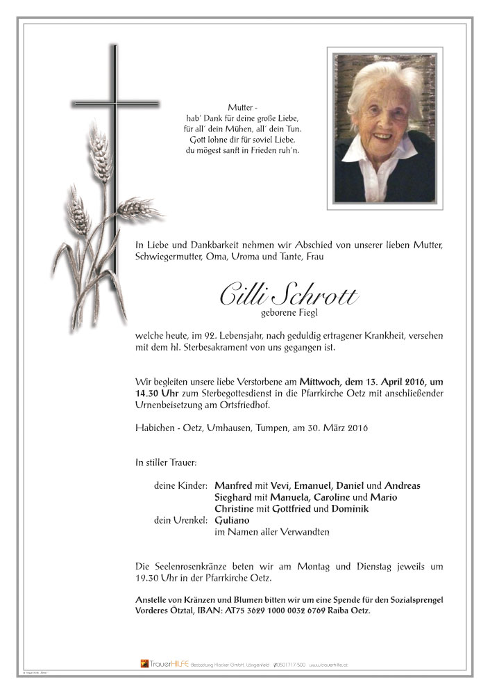 Lieve Manuela,Siggi,Caroline, Mario & Familie Schrott , onze oprechte deelneming met het overlijden van jullie mama Frau Schrott Cilli .