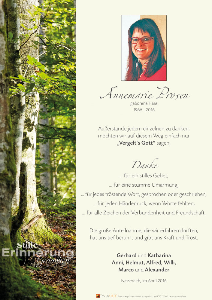 Am allzu frühen Heimgang Eurer lieben Gattin, Mama, Tochter, Schwester, Schwägerin, Schwiegertochter, Tante und Patin möchten wir Euch allen unser aufrichtiges Beileid aussprechen!