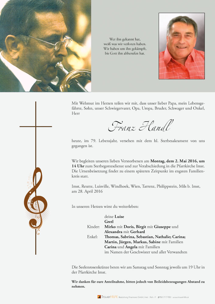 Wir werden Franz immer in guter Erinnerung behalten! Aufrichtige Anteilnahme entbietet Klaudia mit Sebastian29.04.2016 12:50 - Klaudia mit Sebastian, Reutte