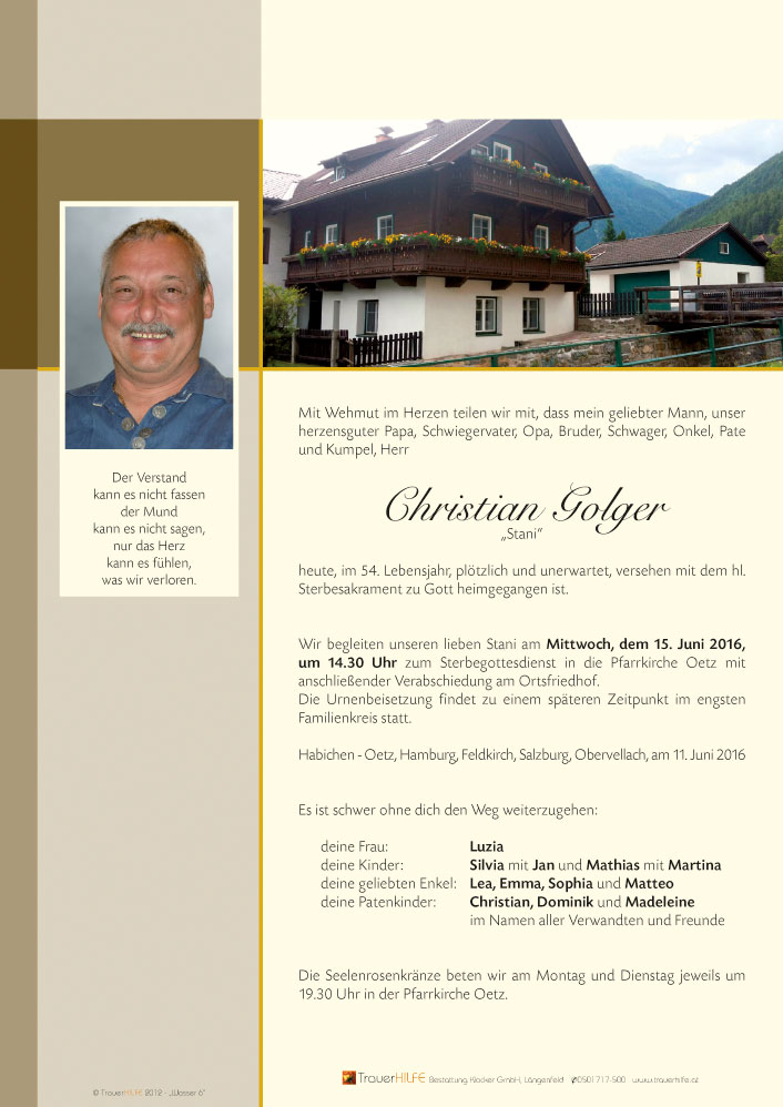 Lieber Teti, lieber Stani.... Wir werden dich in Zukunft, wie bereits viele wichtige Menschen vor dir, im Vogelgesang, im Wehen des Windes, im Aufgang der Sonne, im Sternenglitzer der Nacht, im leise fallenden Regentropfen und in vielen anderen täglichen Augenblicken sehen... So als wärst du nie gestorben....