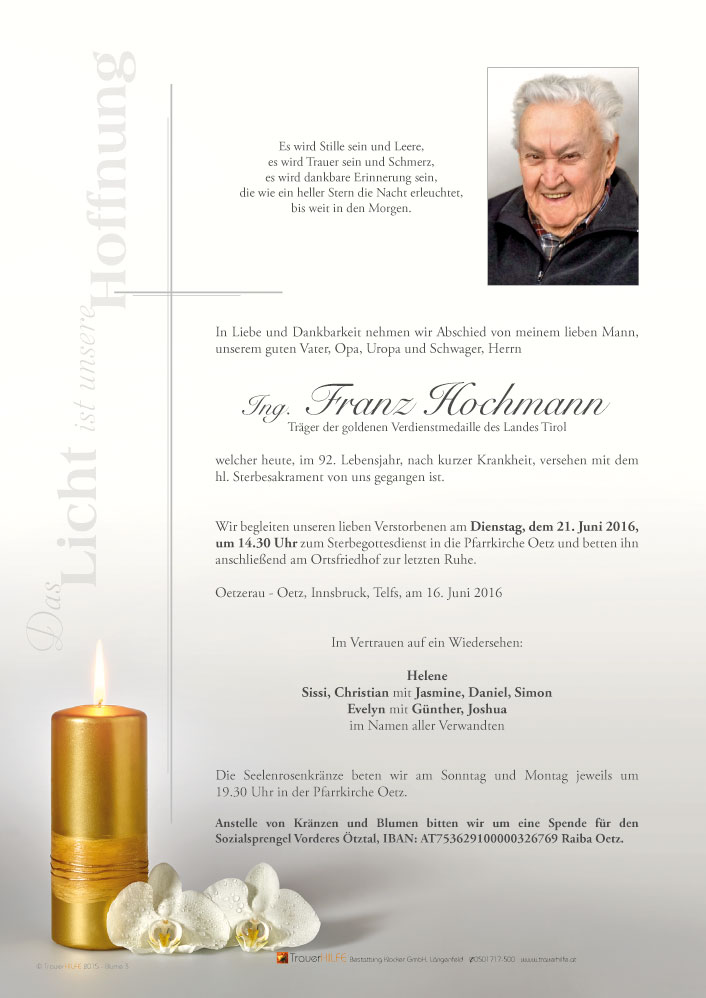 Mit Bestürzung haben wir vom Tod von Herrn Hochmann erfahren. Wir haben ihn als gütigen und verständnisvollen Menschen kennengelernt und so werden wir ihn auch in Erinnerung behalten. Seine Sorge für die Familie wird uns ein Vorbild sein. Bitte nehmen Sie unsere aufrichtige Anteilnahme entgegen. Solange wir uns erinnern, wird er immer noch unter uns sein und wir wissen, daß er im Geiste bei uns ist. Diese Gewissheit kann uns Trost sein.