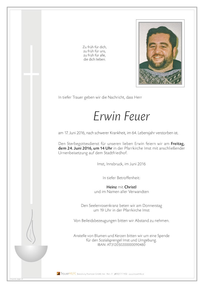 • Requiescat in pace, lieber Erwin und tausend Dank für die schöne Zeit, die wir zusammen in Imst, auf der Hütte und auf Reisen verbringen durften! Dein "liebster" Cousin Alfred (und Familie)