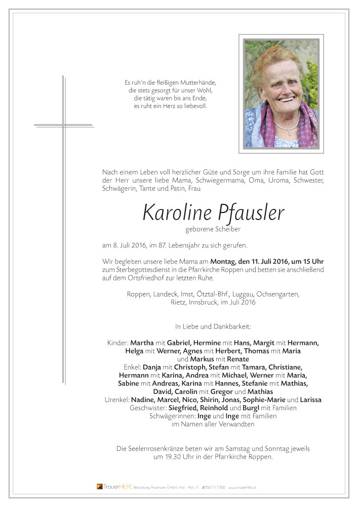 Geschätzte Trauerfamilie. Wir möchten unsere aufrichtige Anteilnahme zum Heimgang Eurer Mama ausdrücken. "Scheibers Karoline" wird uns als lebensbejahende und positiv denkende Frau in Erinnerung bleiben. Mit Karoline sind auch Erinnerungen an unsere Mama verbunden.