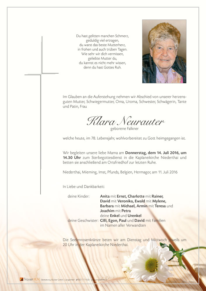 Liebe Trauerfamilien. Menschen die wir lieben bleiben für immer,denn sie hinterlassen ihre Spuren in unserem Herzen.In diesen schweren Stunden besteht unser Trost oft nur darin,liebevoll zu schweigen und schweigend mitzuleiden.Herziches Beileid Lechleitner Gisela Imst und olle Veitn