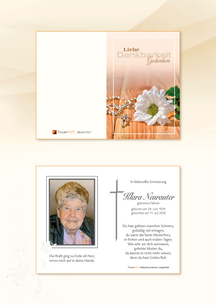 Manchmal kann der Tod auch Erlösung sein. Klara\'s Lebensweg war immer schon steinig und schwer. Aber das letzte Stück ihres Weges war wohl so mühsam und beschwerlich für sie, dass Gott sie nun Heim holte zu ihrem Erich.