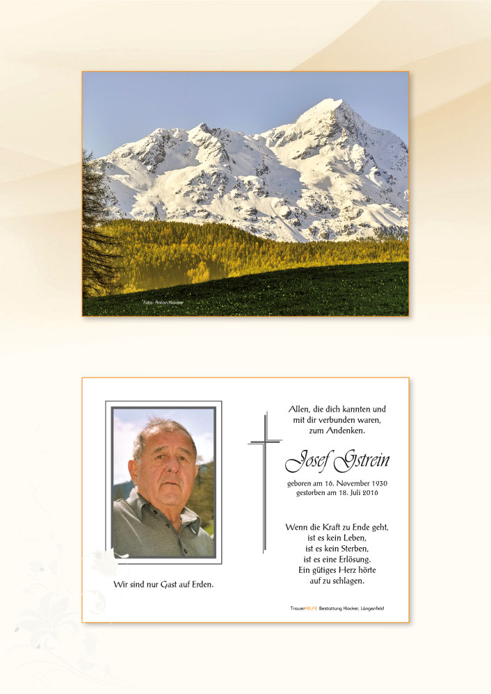 Bestattung wurde durchgeführt von: Daniel Klocker Bestattung Klocker GmbH Oberlängenfeld 41 6444 - Längenfeld Tel.: 05253 5561 zum Bestatter