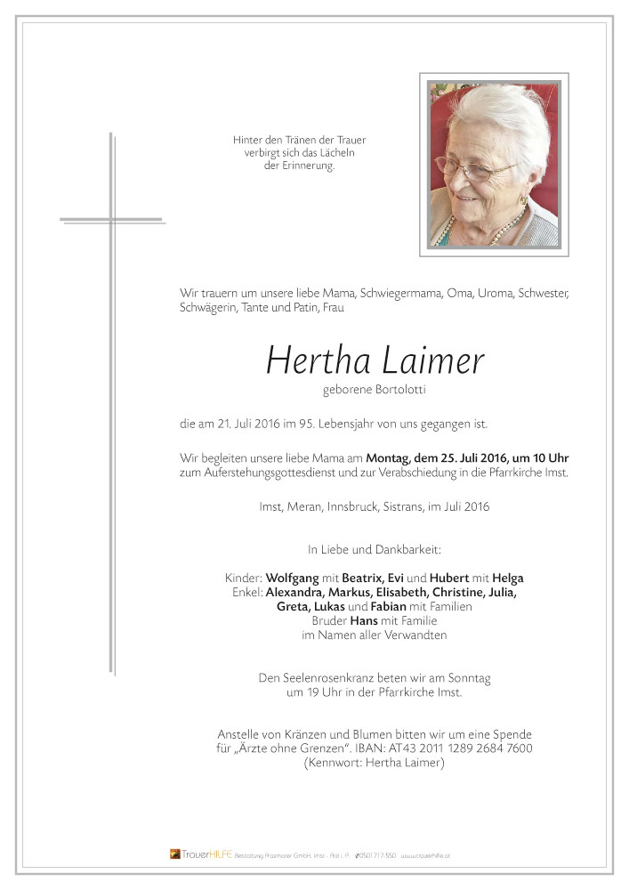 Liebe Familie Laimer, meine herzliche Anteilnahme .Ich werde eure liebe Mutter stets in bester Erinnerung behalten.