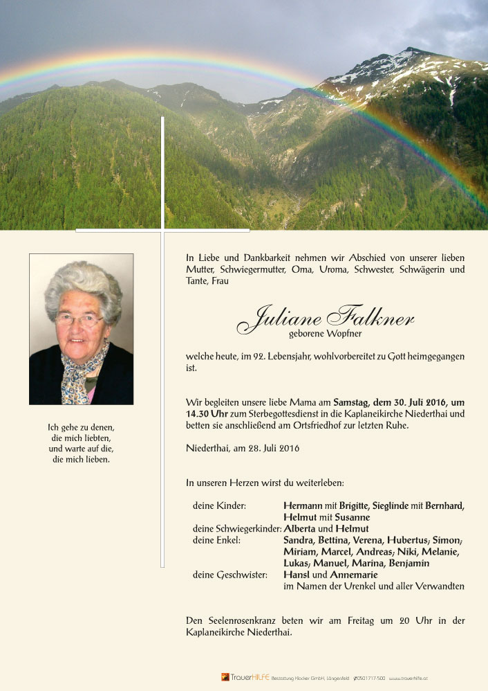 Dass Julie nun bei ihrem Arnold und ihrer Edeltraud ist sei euch Trost und schenke euch Hoffnung in dieser schweren Zeit der Trauer um eure geliebte Mama, Schwiegermama und Oma.