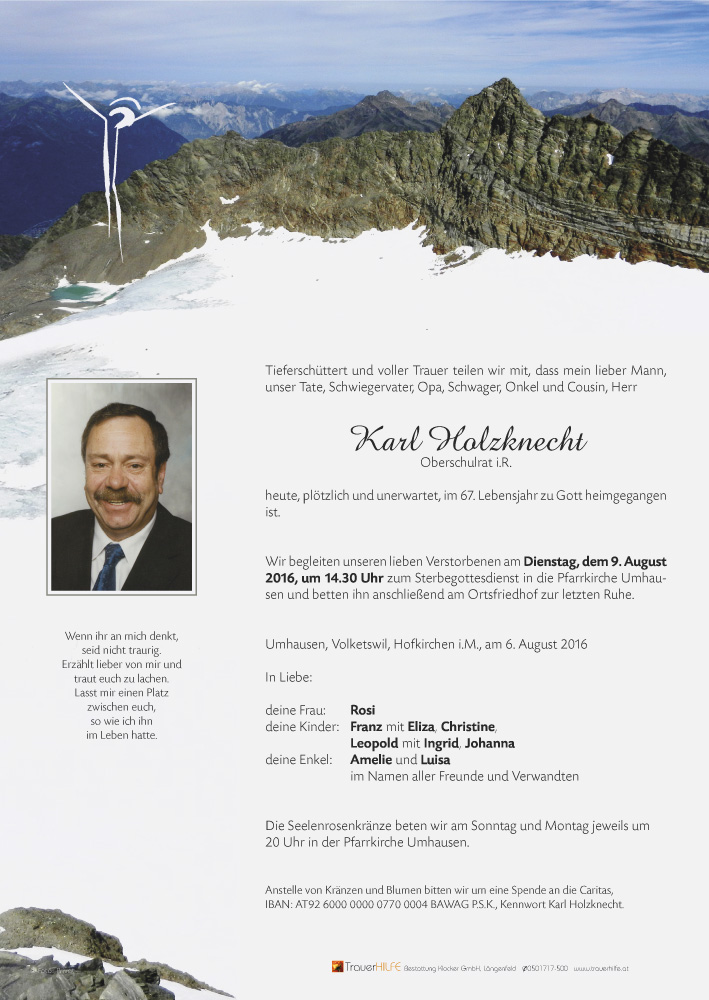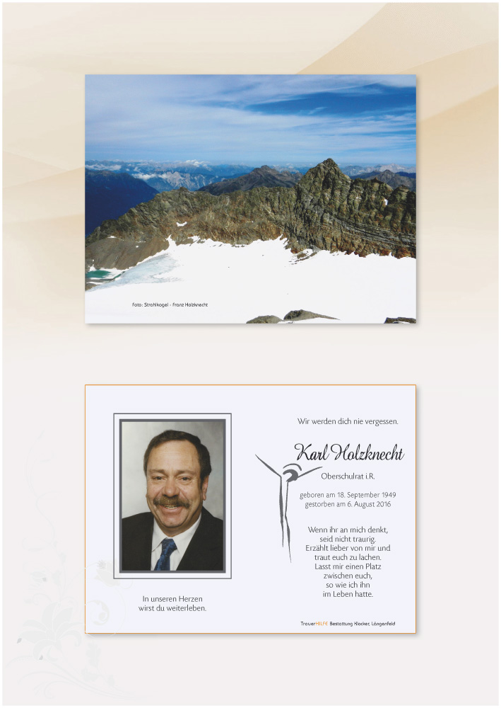 Karl war meinem Mann Heinz und mir in frühen Lehrertagen im Pitztal ein toller Freund und Kamerad.Schöne Erinnerungen werden ihn unvergessen machen. Euch wünsche ich viel Kraft das Schicksal anzunehmen und in seinem Sinne weiterzumachen.