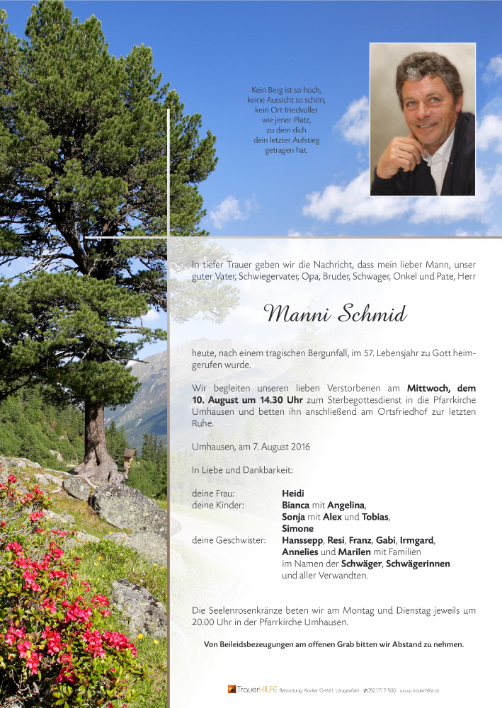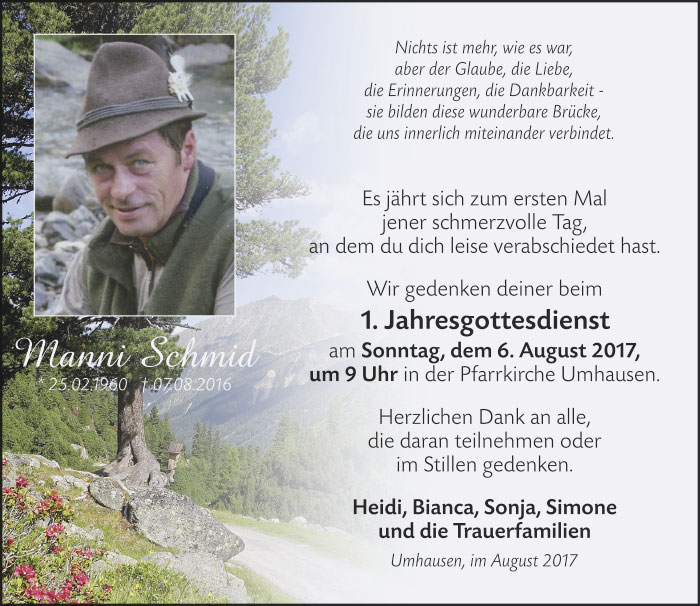 Liebe Heidi und Trauerfamilie - es nimmt der Augenblick was Jahre geben. Mit großer Bestürzung haben wir von Mannis Unglück erfahren. Unser tiefstes Mitgefühl und viel Kraft für die kommende Zeit - entbieten euch Hans, Ulrike, Johannes, Daniel, Felix und Jakob Achleitner Gstöttenbauer aus Klam