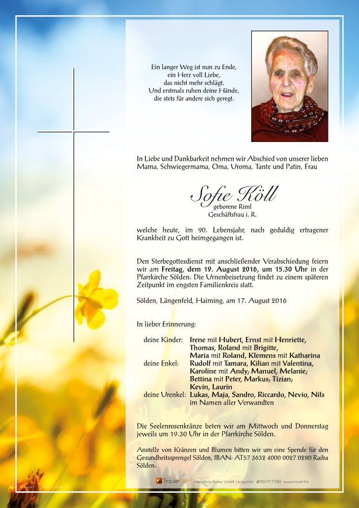 Liebe Irene, geschätzte Trauerfamilie! Der Verlust einer Mama ist nicht in Worte zu fassen. Es ist unendlich schwer Worte der Anteilnahme zu finden. Trost findet man eigentlich nur darin, dass man das Ende des Leidens erkennen kann. Wir werden Sofie so wie sie uns bei ihren Besuchen in Haiming begegnet ist in guter Erinnerung behalten. Viel Kraft in dieser Zeit des Abschiednehmens von einem geliebten Menschen!