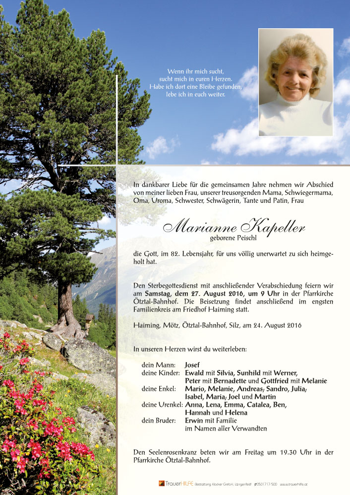 Wir haben erst heute vom Heimgang Eurer guten Frau und Mama erfahren. Wir sind in diesen schweren Stunden in Gedanken bei Euch. Die Seele Eurer lieben Verstorbenen wird Euch für ewig begleiten und Euch Trost und Zuversicht spenden.29.08.2016 17:51 - Manfred Wegleiter