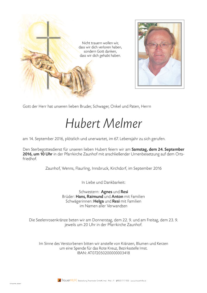 ICH HABE DEN HUBERT IMMER IN BESTER ERINNERUNG BEHALTEN;LEIDER HABE ICH ERST HEUTE VOM HEIMGANG ERFAHREN UND BIN SEHR TRAURIG ! ICH BIN IN DIESER SCHWEREN ZEIT IN GEDANKEN BEI EUCH!!! RUHE IN FRIEDEN LIEBER HUBERT!!! WIR SEHN UNS WIEDER! Hansl Tschenet aus Kufstein29.09.2016 09:22 - tschenet hansl