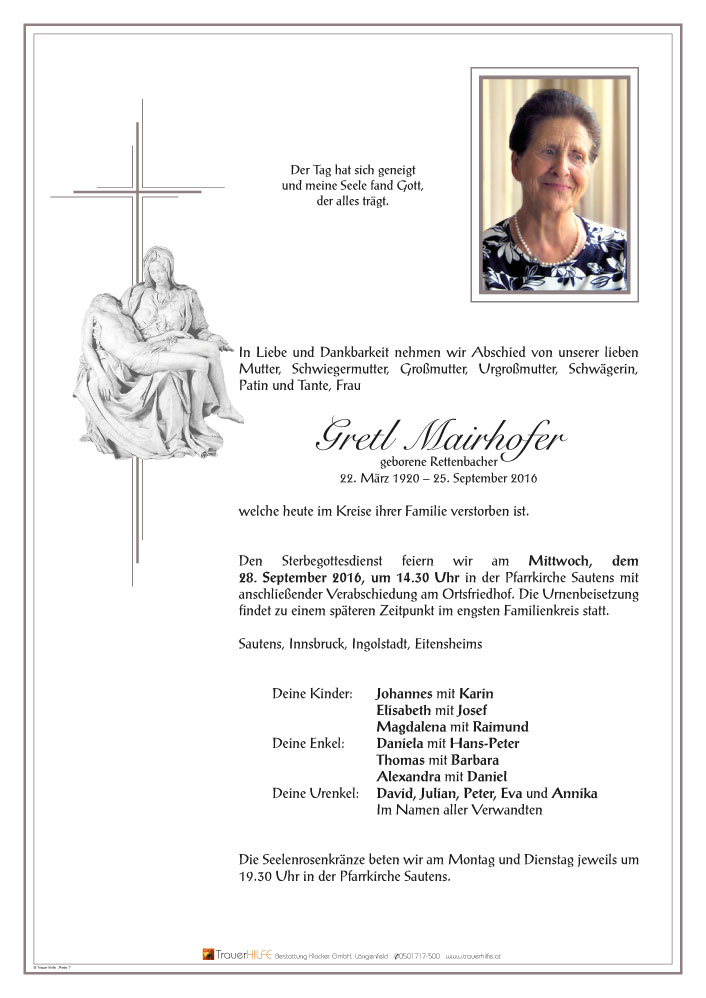 zum Heimgang Deiner lieben Mutter meine aufrichtige Anteilnahme. Eine Mutter zu verlieren, ist immer ein sehr schmerzlicher Verlust. Gott möge Euch helfen, diesen zu tragen. Hans27.09.2016 11:56 - Hans JÄger, Oetzerau