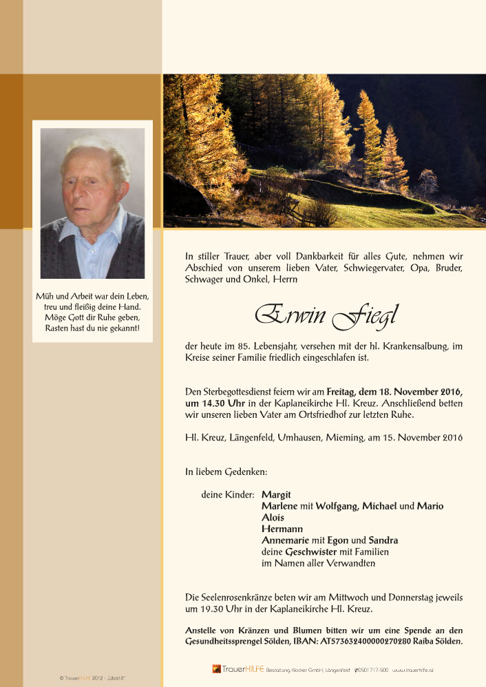 Bestattung wurde durchgeführt von: Daniel Klocker Bestattung Klocker GmbH Oberlängenfeld 41 6444 - Längenfeld Tel.: 05253 5561 zum Bestatter