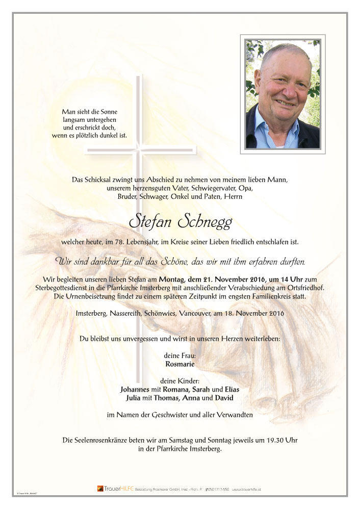 Aufrichtige Anteilnahme der Trauerfamilie und viel Kraft in der schweren Zeit18.11.2016 20:10 - Schnegg Josef und Cornelia mit Clemens, Tobias und Julian