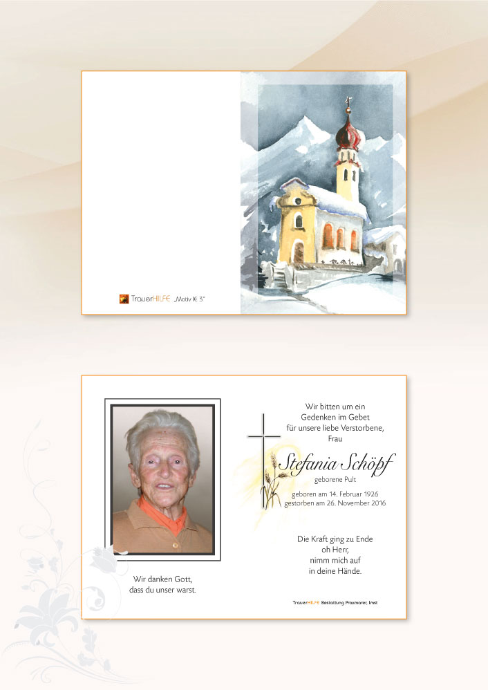 Liebe Oma! Du warsch für mi a Mensch mit einer Gutmiadigkeit, Herzlichkeit und Wäre die ich nie zuvor erfahren habe. Mir isch es vorkäma als wara mir zwoa seelenverwandt. Dei Art, dei liab hot unbeschreibli guat ton. Oft war i abend bei dir am Bett, dia Stunda wer i nia vergessa. Hon i gmuant der Himmel stirzt in, hosch du wieder di sunne hinter de wolke kholt. Du hasch mi loben kenna wia kua zwoater und hasch mi wachsa lassa. Oma dei Nähe hat so guat to, dass is in Worta in ausdruck kann. Iatz bleibt mar lei no des uane zum soga: DI vergiss i NIE, DU warsch a wunderbarer Mensch für MI. Danke für alles Oma (Inser Schutzengel im Himmel)