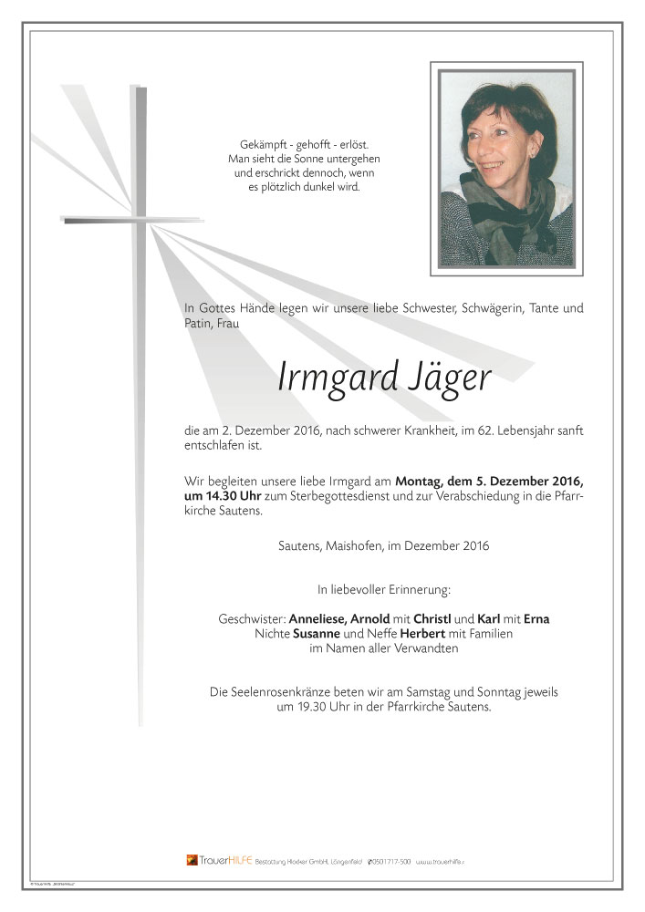 Auf diesem Wege entbiete ich mein aufrichtiges Beileid am Tode euer lieben Schwester Irmgard.
