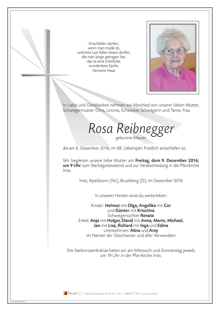 Liebe Familie Reibnegger, auch wir möchten Euch unser Beileid aussprechen. Wir denken immer gern an die schönen Urlaube und Besuche bei Euren Eltern zurück und werden Eure Mutter immer in Gedenken behalten.
