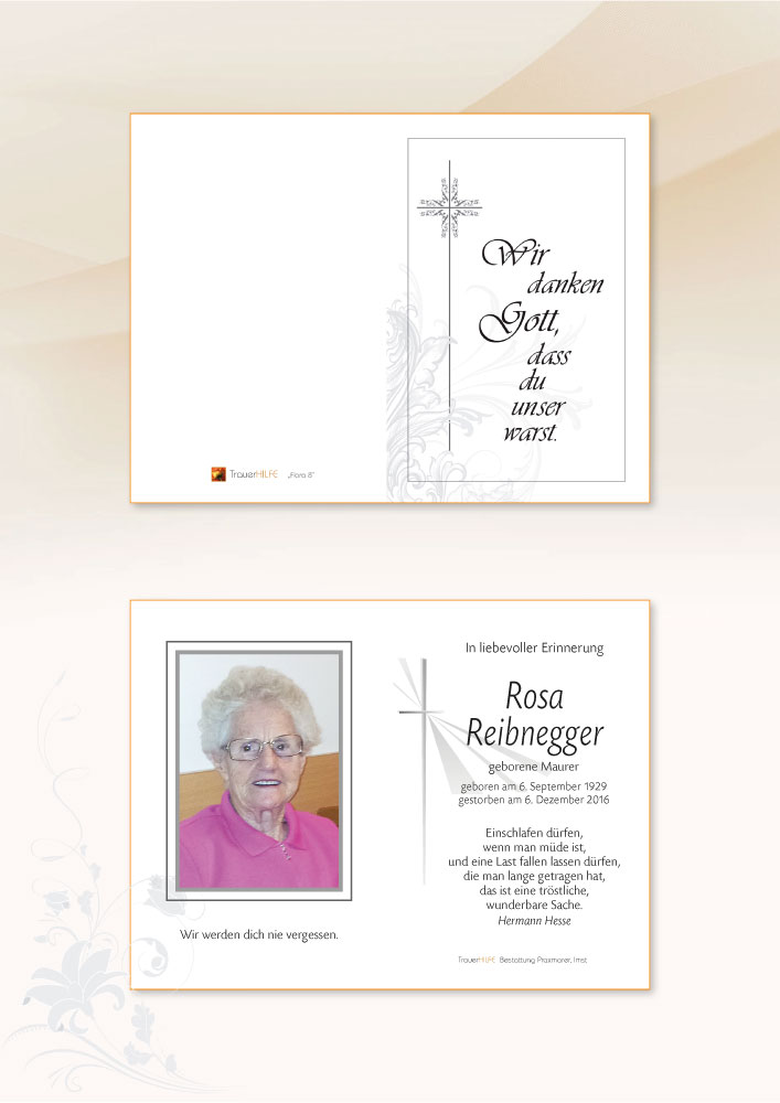 Wir glauben und hoffen, dass uns bei Gott die Fülle des Lebens erwartet. Für diese Welt ist ein Leben zu Ende, für den, der glaubt, hat ein Leben begonnen. Wir glauben und hoffen, dass in Gott alles Leid, alle Schmerzen, alle Ohnmacht ein Ende hat. Gott schenke ihr die ewige Freude in seinem Reich. In diesen Tagen der Trauer gebe euch die Erinnerung an alle schönen gemeinsamen Zeiten, viel Trost und Kraft.