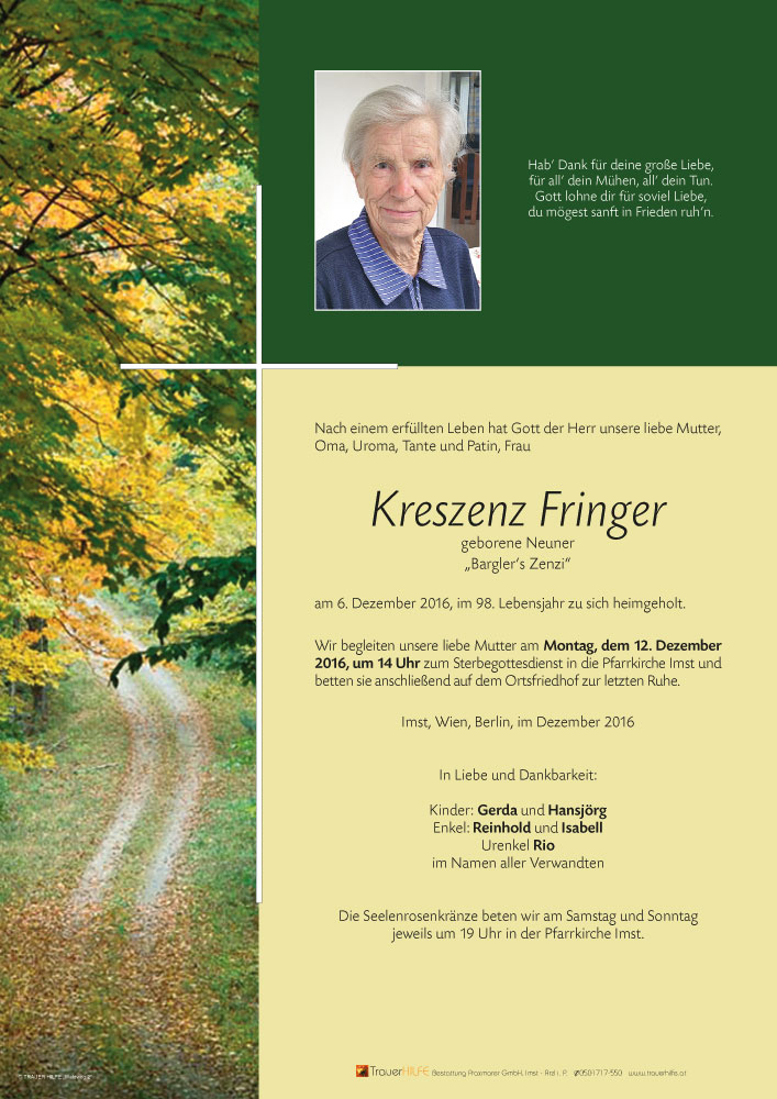 Liebe Zenzi, Dein Witz und scharfer Verstand hat uns so lange Begleiten dürfen - Dich als Nachbarin zu haben wird für immer Unvergesslich sein. Herzliche Anteilnahme Benjamin Schwetz mit Familie