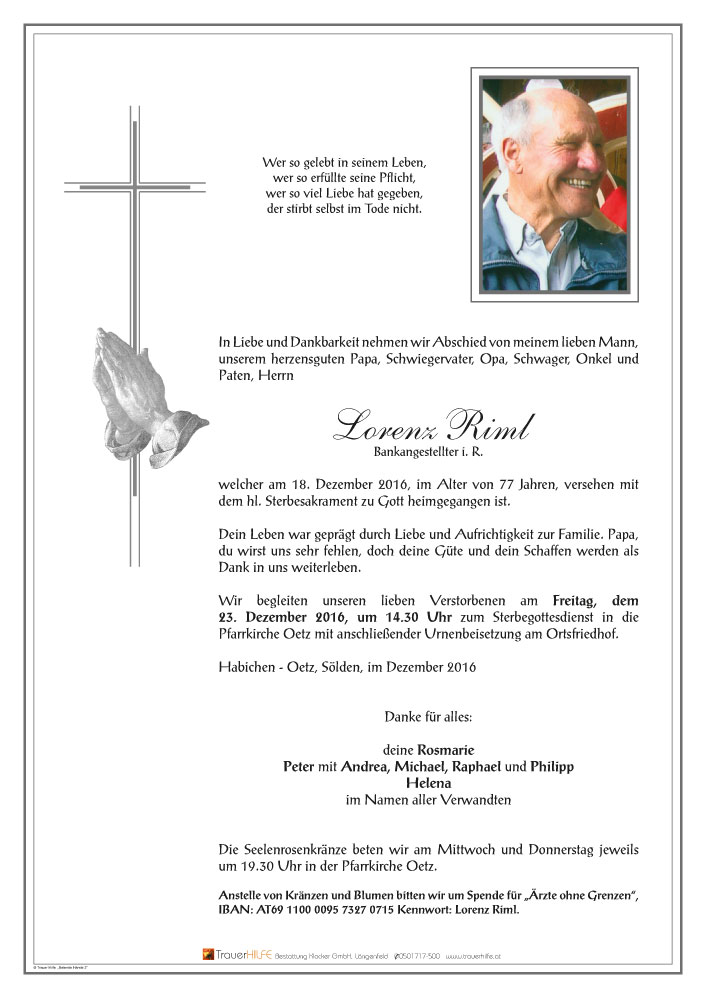 Neue Kerze für Lorenz Riml entzünden.
