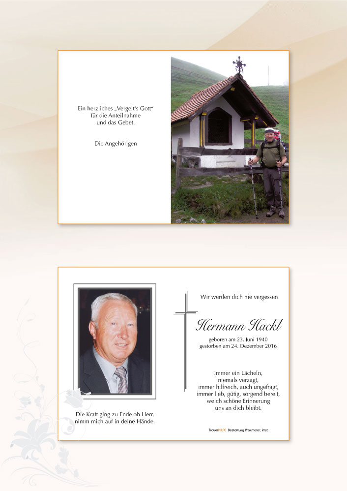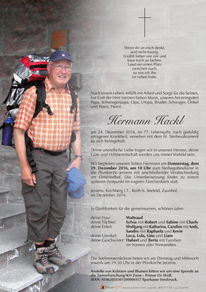 Onkel Hermann, danke für deine Herzlichkeit, die vielen wertvollen Ratschläge und die oft auch so lustigen Gespräche mit dir. Ich bin stolz dass ich dich als Onkel hatte. Du warst Vorbild für mich und wirst mir immer in Erinnerung bleiben.