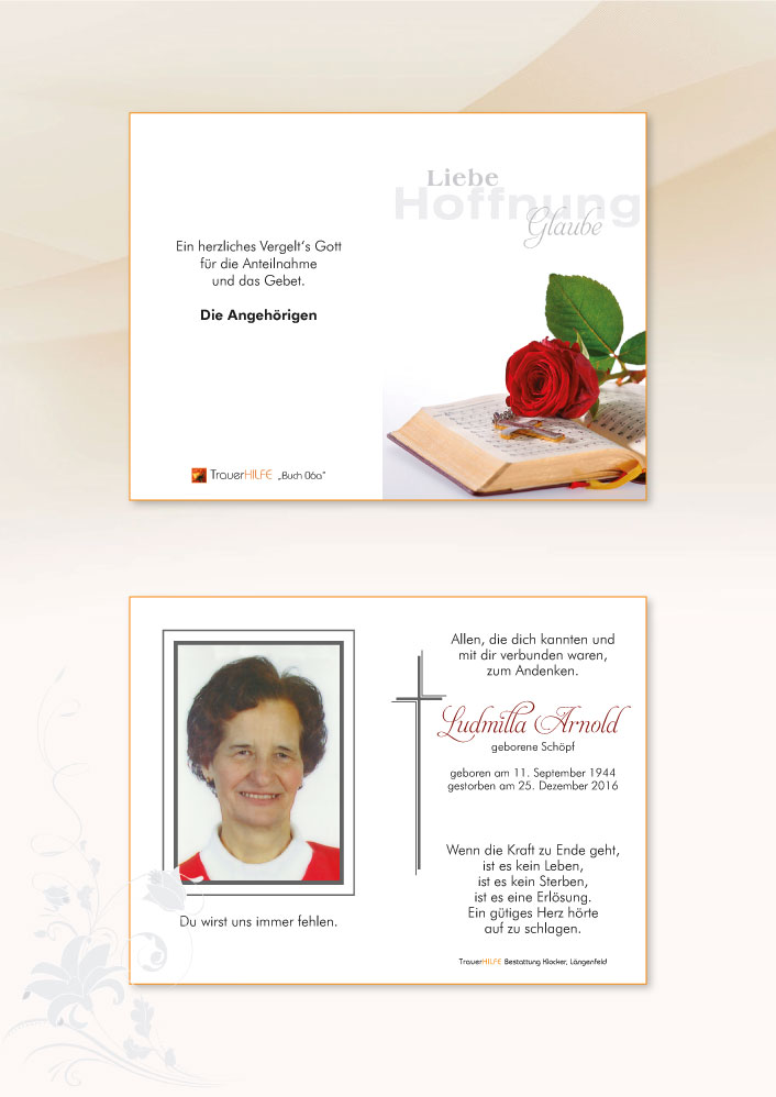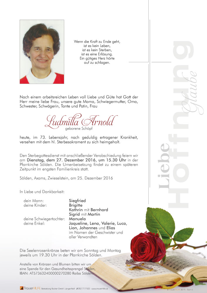 Das Schwerste was uns das Leben abverlangen kann, ist wohl der Abschied von einem geliebten Menschen. Aber habt keine Angst etwas von dem zu verlieren, was eure gemeinsame Zeit reich gemacht hat. Denn viele schöne Erinnerungen sind in euren Herzen gespeichert; und wenn euch die Traurigkeit einholt, dann könnt ihr darin blättern und Ludmilla wir euch ganz nah sein.