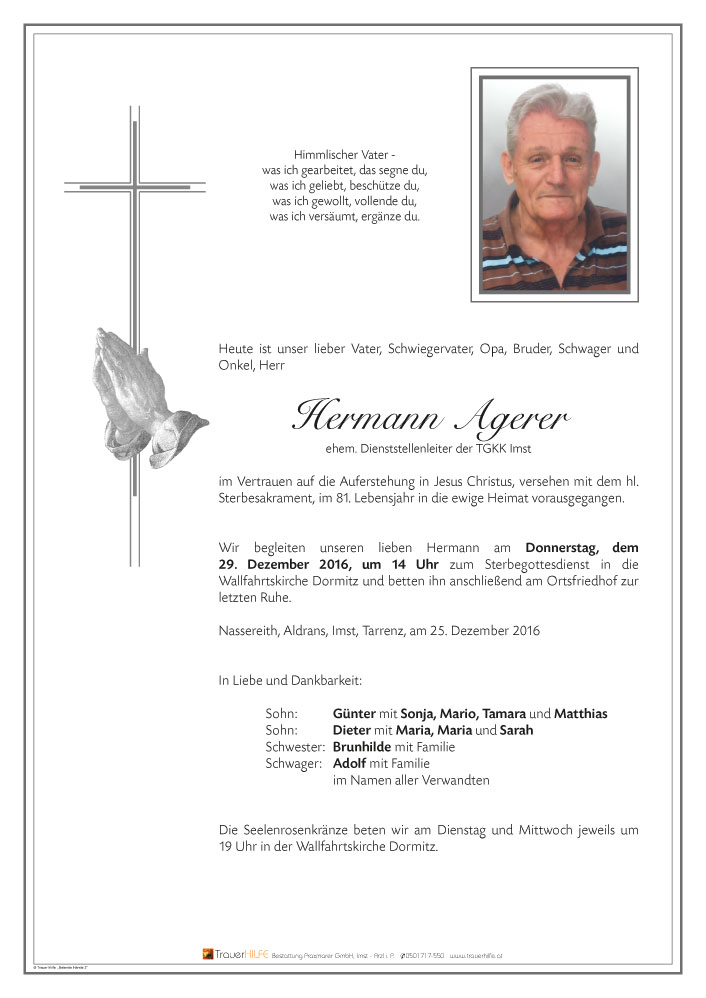 Möge die Erinnerung an Hermann in euren Herzen brennen – einer Kerze gleich – leuchtend und wärmend, dann wird euer guter Vater immer bei euch sein.