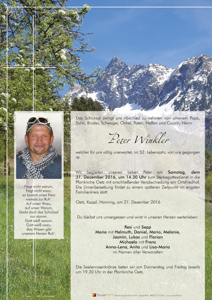 und sprach: Komm heim. Pfiat die Peter wir werden dich nie Vergessen Edith u Bendl30.12.2016 13:49 - Neurauter Edith