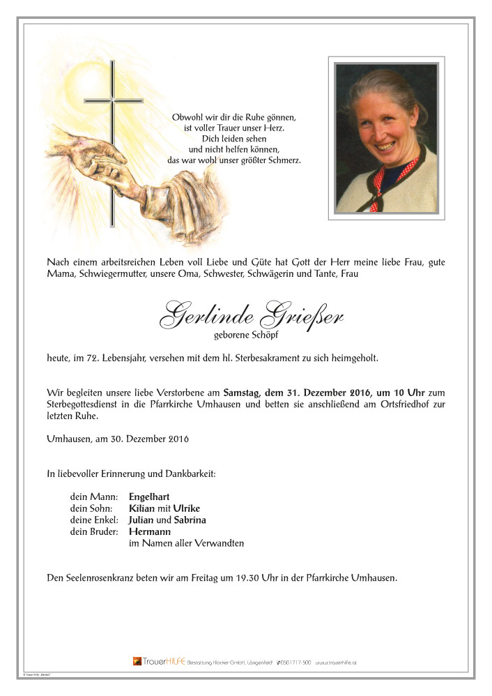 unser aufrichtiges Beileid zum Tod eurer Gerlinde. Wir behalten Gerlinde als sehr freundliche und feine Nachbarin in Erinnerung. Sie wird in unserer "Gossen" fehlen.30.12.2016 20:52 - Reinhard und Julia mit Kinder