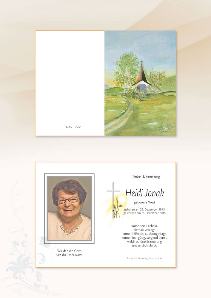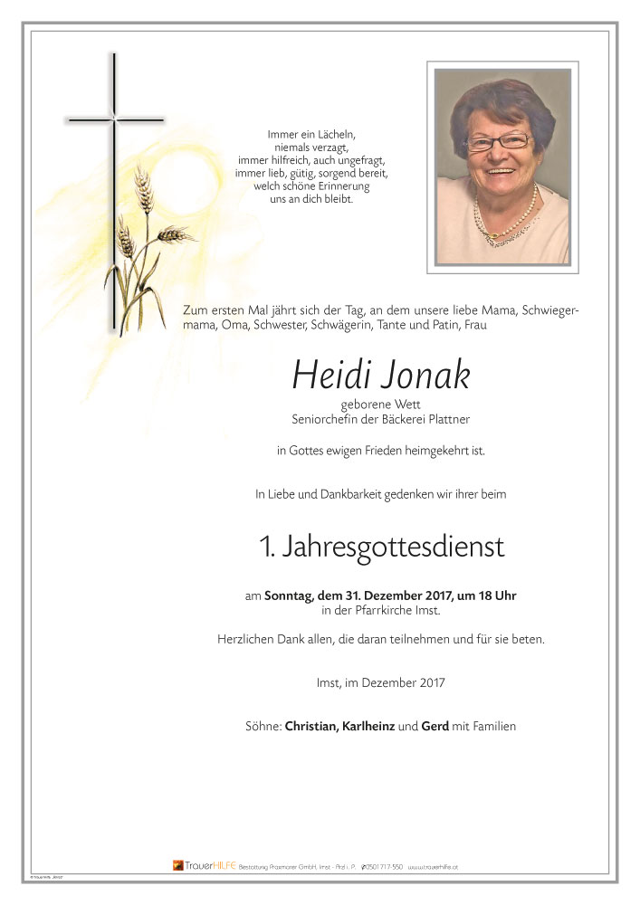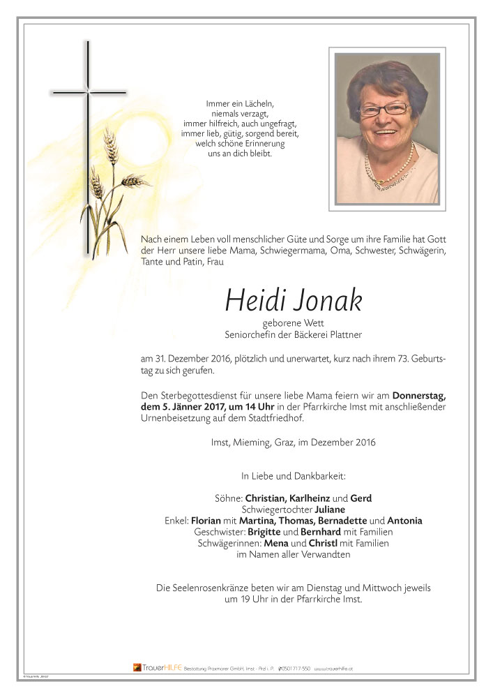 Möge Euch dankbare Erinnerung an eure Mama, an ihr Wirken und Sein den Schmerz und die Traurigkeit lindern. Ich werde Frau Jonak als liebe und freundliche Frau in Gedanken behalten.