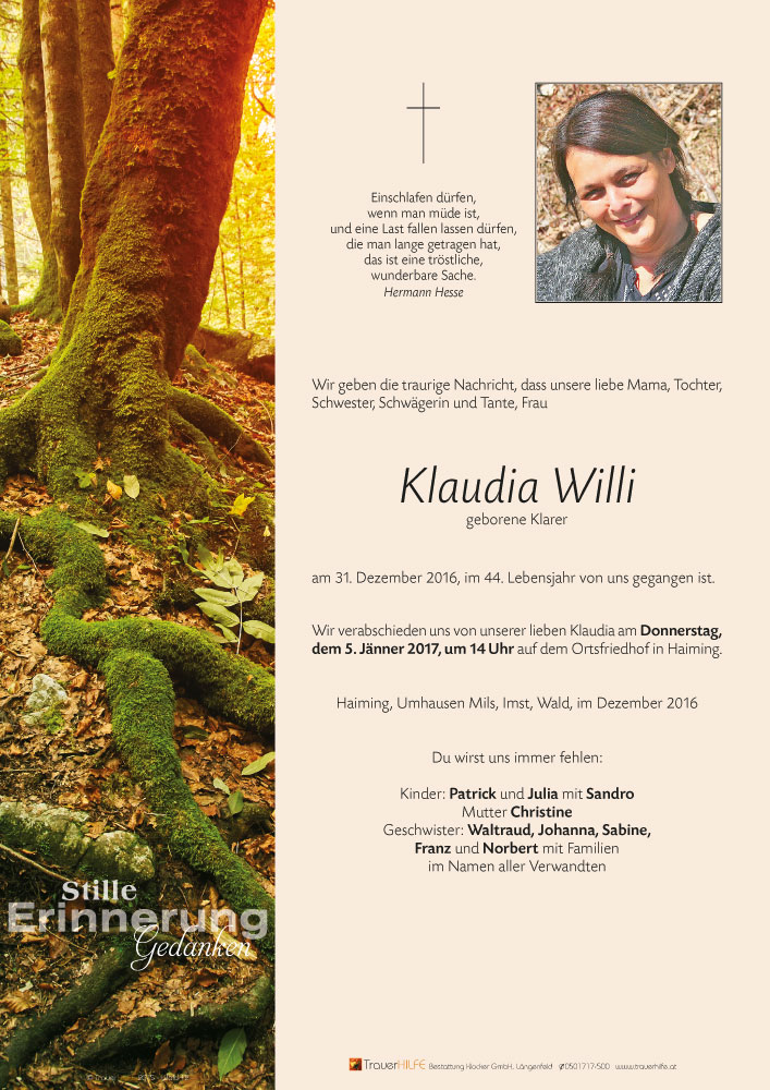 Zum Heimgang eurer lieben Klaudia