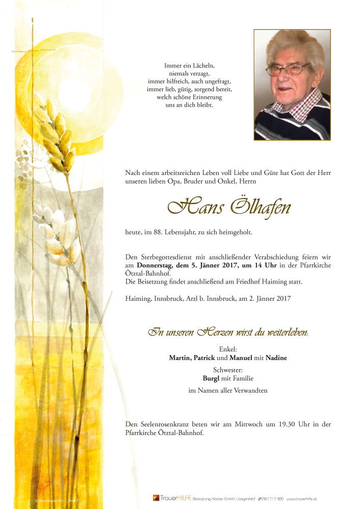 Geschätzte Trauerfamilie. Hans wird uns als guter Familienmensch, Metzger vom alten Schlag und gemütlicher Kartnerpartner in Erinnerung bleiben. Er hat sich seine Ruhe verdient. Wir denken in den schweren Stunden der Trauer an euch.