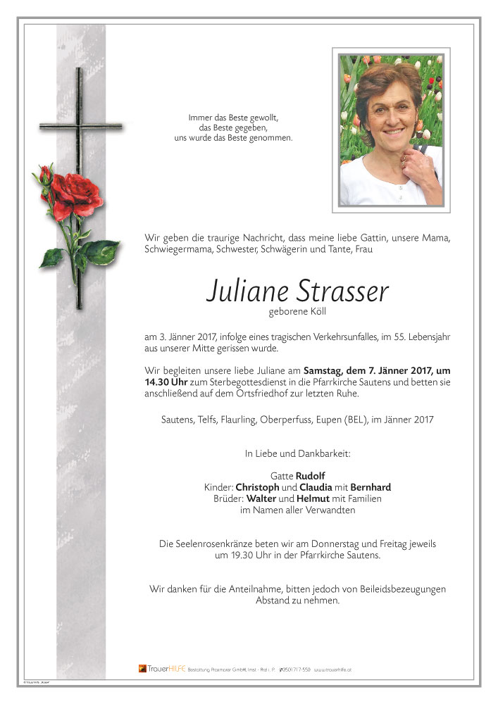 Lieber Rudi , liebe Claudia und lieber Christoph. Auserstande die richtigen Worte zu finden. Juliane ein Sonnenschein einfach so aus dem Leben gerissen. Es tut mir unwahrscheinlich Leid . Viel Kraft in dieser schweren Zeit. Ursula mit Familie und Mitarbeiterin Melanie.