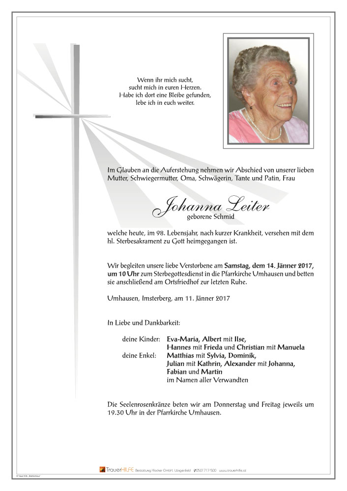 Aufrichtige Anteilnahme am Tode Eurer lieben Hanni entbieten Familie Scharfetter Gasthof Andreas Hofer Umhausen.12.01.2017 17:04 - Familie Scharfetter Umhausen