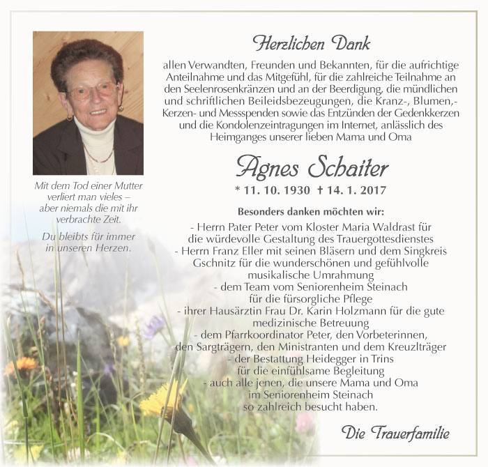 Bestattung wurde durchgeführt von: Karl Neurauter Karl Neurauter Bestattung Heidegger Brennerstraße 69 6150 - Steinach am Brenner Tel.: 05275 5211 zum Bestatter
